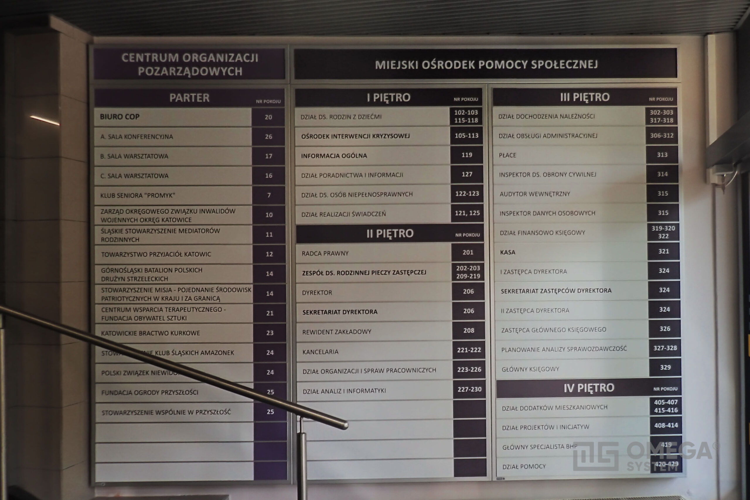 Profile Omega System SIGNS zostały stworzone z myślą o komponowaniu własnych tabliczek informacyjnych. Ich wymiary i układ zależą od indywidualnych preferencji i potrzeb Klientów. W skład opracowanego przez nas systemu wchodzą w głównej mierze tablice informacyjne z wymiennymi panelami lub ze stałym szyldem. Podstawą ich konstrukcji są profile aluminiowe, a możliwość zamówienia dowolnego wypełnienia sprawia, że tablica informacyjna może zostać dostosowana do niemalże każdego wnętrza. Tego typu szyldy charakteryzują się szybką i stosunkowo łatwą wymianą paneli, a we wszystkich modelach można wybierać zarówno kolor, jak i formę i krój czcionki. Szczegółowe wymiary także uwzględnione są po konsultacji z Klientem. Tablice i szyldy informacyjne Omega System spełnią oczekiwania nawet najbardziej wymagających zleceniodawców. W naszym asortymencie znajdują się: