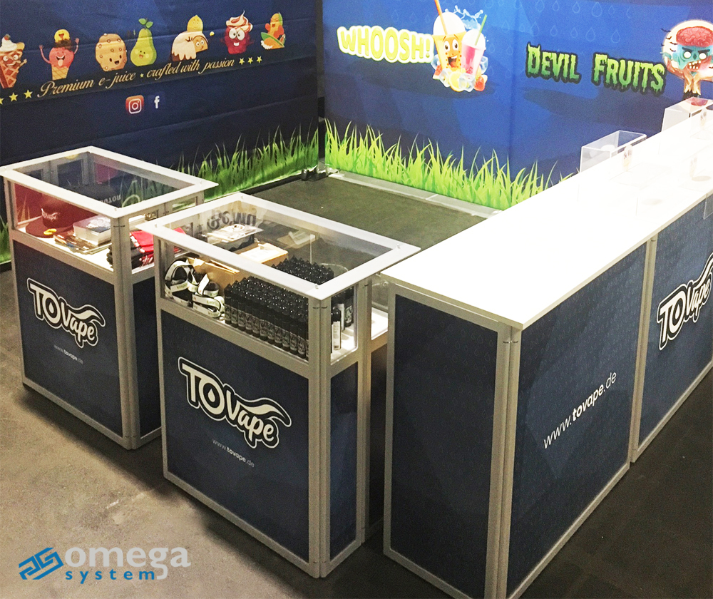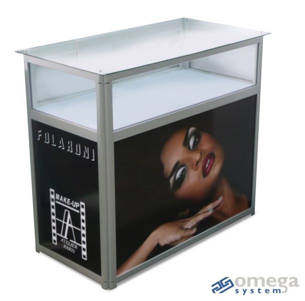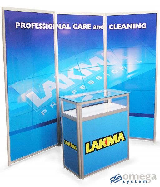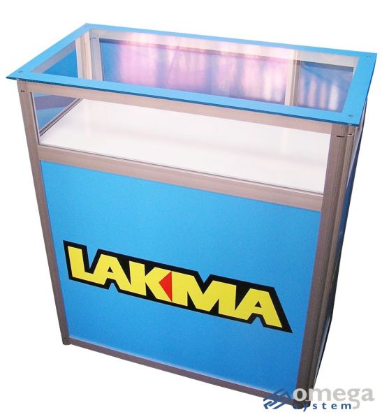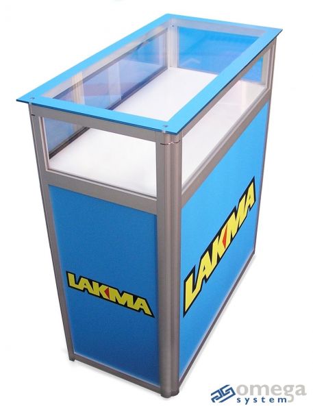 lada złożona z kilku poziomów ekspozycyjnych: blatu, zamkniętej gabloty, paneli graficznych informacyjno – reklamowych