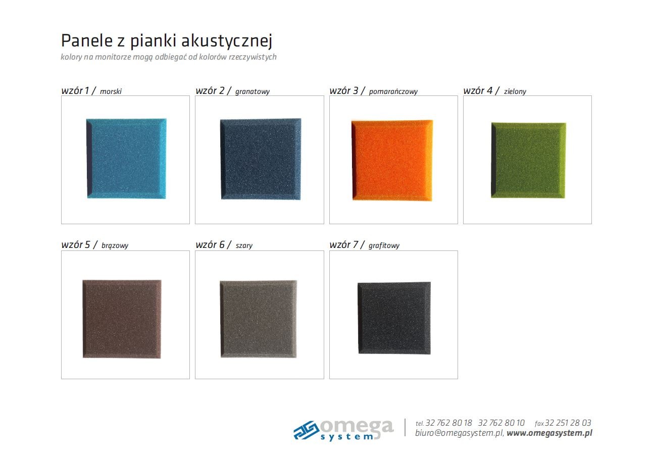 Konstrukcja wykonana z estetycznych profili aluminiowych. Zastosowane wypełnienie to gąbka akustyczna zapewniająca najwyższy poziom absorpcji dźwięku (dla paneli o grubości 5 cm i większej: 0,95s, klasa A)